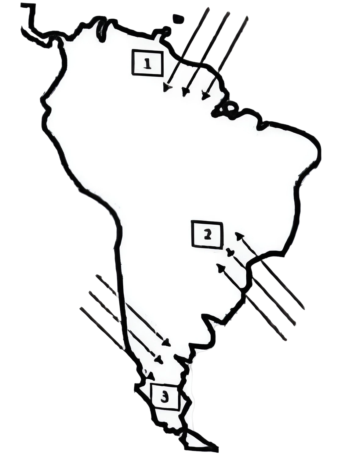 3- حدد انواع الرياح السائدة في فصل الشتاء بالشكل التالي مع ما يناسبها: [صورة لخريطة أمريكا الجنوبية عليها 3 مناطق مرقمة مع أسهم تشير لاتجاهات رياح] المنطقة 1: شمال القارة (قرب خط الاستواء). المنطقة 2: الساحل الشرقي الأوسط للقارة. المنطقة 3: أقصى جنوب القارة. شرح السؤال أمامك خريطة لقارة أمريكا الجنوبية توضح اتجاهات الرياح السائدة في فصل الشتاء (يوليو في نصف الكرة الجنوبي). عليك مطابقة الأرقام على الخريطة مع أنواع الرياح الصحيحة من الخيارات المتاحة. تذكر أنماط الضغط الجوي والرياح العالمية وتأثيرها على القارات. (1) رياح جنوبية شرقية (2) رياح شمالية شرقية (3) رياح عكسية شمالية غربية (1) رياح شمالية شرقية (2) رياح شمالية غربية (3) رياح جنوبية شرقية (1) رياح عكسية شمالية غربية (2) رياح شمالية شرقية (3) رياح جنوبية شرقية (1) رياح شمالية شرقية (2) رياح جنوبية شرقية (3) رياح عكسية شمالية غربية الإجابة الصحيحة هي ( (1) رياح شمالية شرقية (2) رياح جنوبية شرقية (3) رياح عكسية شمالية غربية ). في فصل الشتاء في نصف الكرة الجنوبي (والذي يوافق شهر يوليو تقريباً)، يكون توزيع الرياح السائدة على أمريكا الجنوبية كالتالي (حسب الخريطة رقم 49 في الكتاب، ص 136، والتي تمثل "المناخ في فصل الشتاء (شهر يوليو)"):* المنطقة 1 (شمال القارة، قرب خط الاستواء): تهب عليها الرياح التجارية الشمالية الشرقية القادمة من المرتفع شبه المداري في شمال الأطلسي.* المنطقة 2 (الساحل الشرقي الأوسط للقارة): تهب عليها الرياح التجارية الجنوبية الشرقية القادمة من المرتفع شبه المداري في جنوب الأطلسي.* المنطقة 3 (أقصى جنوب القارة): تقع ضمن نطاق تأثير الرياح العكسية (الغربية) الشمالية الغربية. * لماذا الخيارات الأخرى غير صحيحة؟* الخيارات الأخرى تقدم ترتيبات خاطئة لأنواع الرياح أو اتجاهاتها في المناطق المحددة خلال فصل الشتاء الجنوبي. للتوسع:* كيف يختلف نظام الرياح هذا في فصل الصيف الجنوبي (يناير)؟* ما هو تأثير هذه الرياح على توزيع الأمطار ودرجات الحرارة في مختلف أنحاء قارة أمريكا الجنوبية؟ (الفصل الخامس: قارة أمريكا الجنوبية، المناخ - المناخ في فصل الشتاء (شهر يوليو)، صفحة 136)